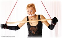 Keywords: ballgown, rope bondage, shoes, spreader bar, cloth gag, stockings